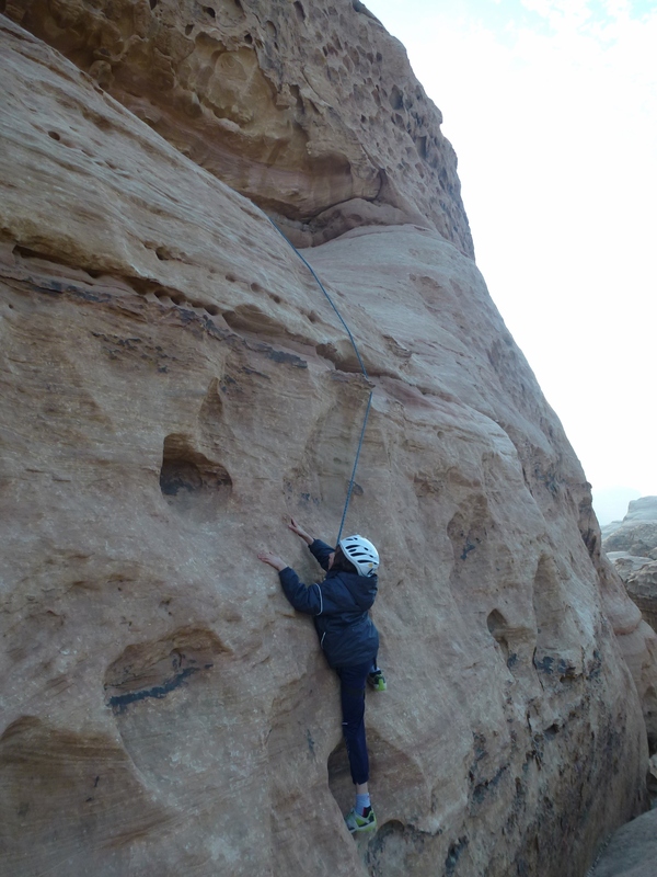 Pour faire connaissance avec le caillou, on s’oriente vers Doodle Rum dans le wadi Shelali. On le prend cool sur l’approche avec une petite visite des sources de Lawrence… Puis avant de commencer la voie elle même, on goûte aux joies des approches locales où il faut avoir le pied et l’oeil bédouin!