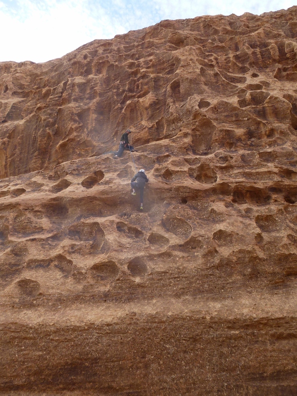 Pour ouvrir les festivités en beauté nous partons directement à Barrah canyon, un endroit unique au monde. Le frère d’Ali nous abandonne au pied de Pluie dans le désert notre premier objectif… quelle étrange sensation de se retrouver de nouveau là, si vite!! On reprend contact avec le grès Jordanien, ses formes et ses couleurs uniques. l’escalade n’est pas très dure dans cette jolie voie, parfaite pour remettre Fred d’aplomb après une longue période sans grimpe. 3 longueurs et une grande traversée plus tard nous voilà au pied de notre première bédouinerie du séjour… avec l’expérience nous savons qu’à Wadi Rum la descente fait partie de la course et qu’il ne faut pas se relâcher avant d’être en bas! Itinéraire rusé, rappels, désescalade exposée, obstacle de dernières minutes… elles réservent toujours leur lot de surprise! Là ou ça parait impossible se dessine parfois un chemin improbable…là où ça paraît évident apparaît à la dernière seconde un siq infranchissable… déroutant au début et pas facile à lire!!
