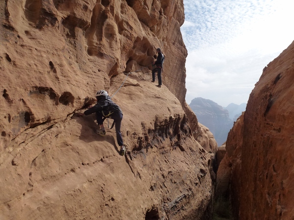 Il est 9h30 quand nous décollons et pour se mettre en jambe, nous traversons le Grand Siq. Chacun son truc. D’emblée on est replongés dans les mêmes acrobaties qu’hier. Dalles expos, désescalade, pas de IV+. En tous cas ce passage est bien sympathique et permet de gagner facilement les déserts d’Al Thalamiyah. Atelier inédit aujourd’hui : la grimpe sur arbre pour éviter un passage trop dur. Il faut monter sur les plus hautes branches qui ploient un peu sous la masse des envahisseurs! Juste après un très court pas de bloc verrait bien des larmes si les bédouins n’y avait pas taillé une salvatrice réglette (et poser un escalier bédouin)!