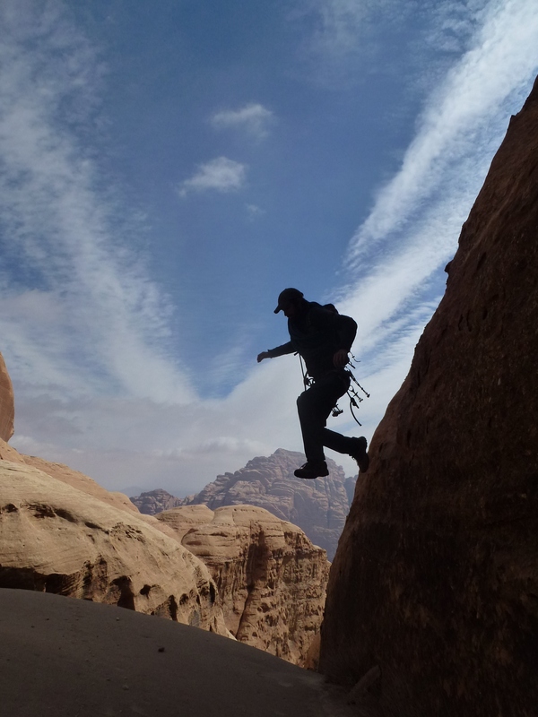 Et bien on sera pas déçu pas cette première journée qui nous emploiera de 10h du matin jusqu’à 19h! Au programme visite de moultes wadi, enjambement de crevasses, descente dans les Siq, escalade de dômes, et j’en passe…. rien d’extrême en termes purement technique mais une recherche d’itinéraire corsée avec un topo succinct qui nous vaudra quelques errances passagères! Dès lors qu’on se plante pas mal et que l’on cherche à s’assurer un tant soit peu dans les passages expos, le timing explose…. Mais qu’importe, on est équipé en conséquence.