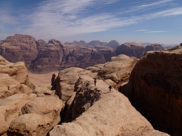 Mais pour nous ça ne s’arrête pas là. Après un court conseil de guerre et un bilan des provisions, la décision est unanime : on continue! On a plus trop d’eau mais c’est pas grave, on fermera la bouche! On rempile donc pour quelques heures de crapahute en direction du sommet N du Jebel Rum. Là le topo que nous avons devient vraiment limite, voire faux. La tactique du chien vit son heure de gloire! Passé le Jebel Nord, peu de difficultés (à l’exception d’un mur de 7-8 mètres à désescalader, avec des prises taillées) mais un itinéraire pas toujours fluide.