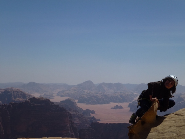 Bonne idée car la voie s’avère splendide! Les marches d’Assaf ne sont pas faciles, l’escalade est soutenue dans le 3 le long de l’éperon avec des longueurs magnifiques dans ce niveau de difficulté. On rejoint dans le haut une arête de dôme (spécialité locale) de toute beauté… Une fois de plus on est bluffé par la beauté de ces itinéraires bédouins, d’une logique imparable mais en même temps sans concession (ça ne passe qu’à un endroit!). Un saut de crevasse émouvant avant d’arriver au niveau du cirque sommital… Au lieu de rejoindre Hammad’s route, nous prenons une variante plus directe (kairnée) qui termine par 10 mètres de grimpe un peu poussiéreuse non loin de ce Jebel. La joie éclate là haut! Une fois de plus on est comblé… Le rêve continue. As-t-on déjà vécu dans un autre univers que celui-ci?